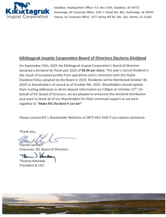Kikiktagruk Inupiat Corporation (KIC) is an Alaska Native Corporation organized to serve the Inupiat people of Kotzebue, a community above the Arctic Circle in Northwest Alaska.