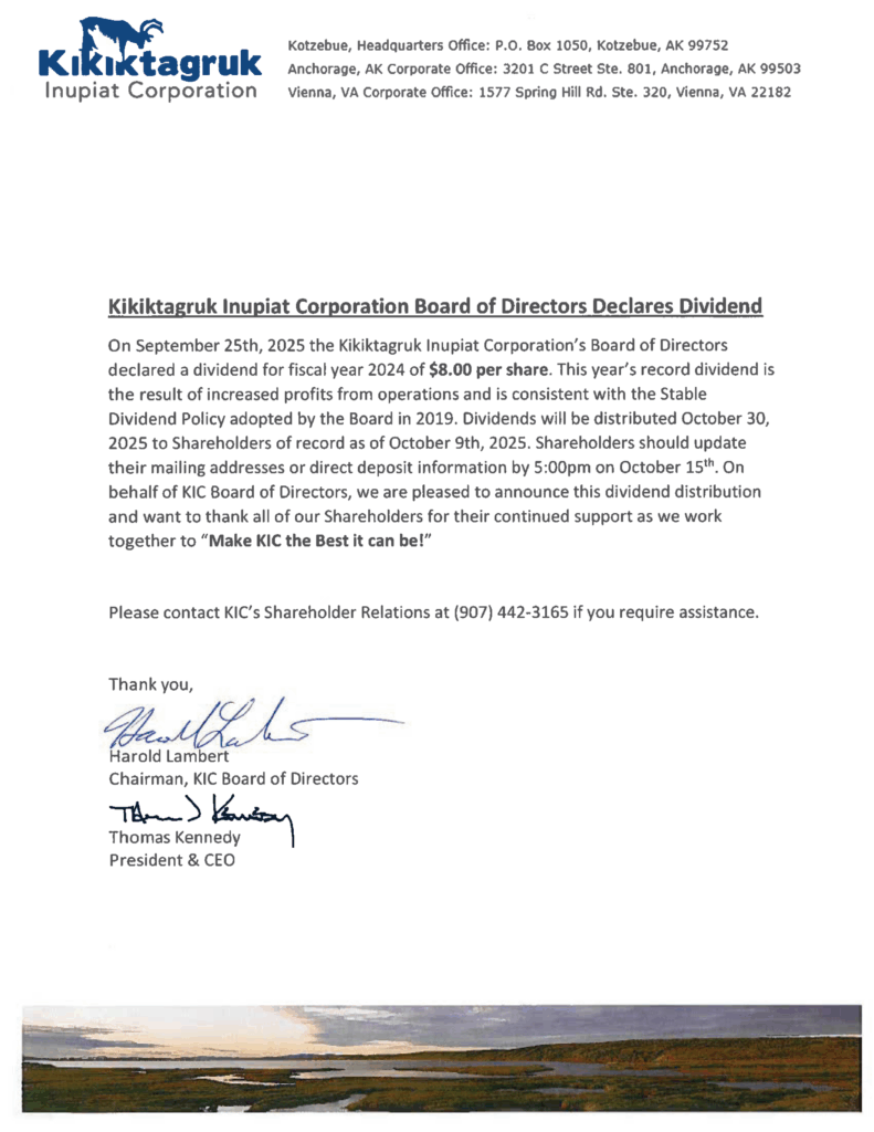 Kikiktagruk Inupiat Corporation Board of Directors Declares Dividend